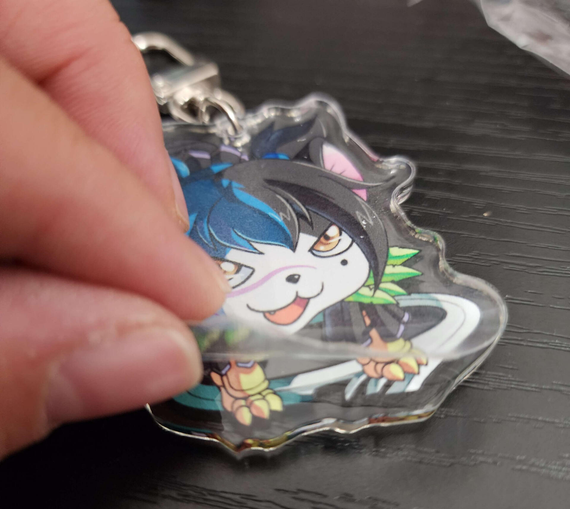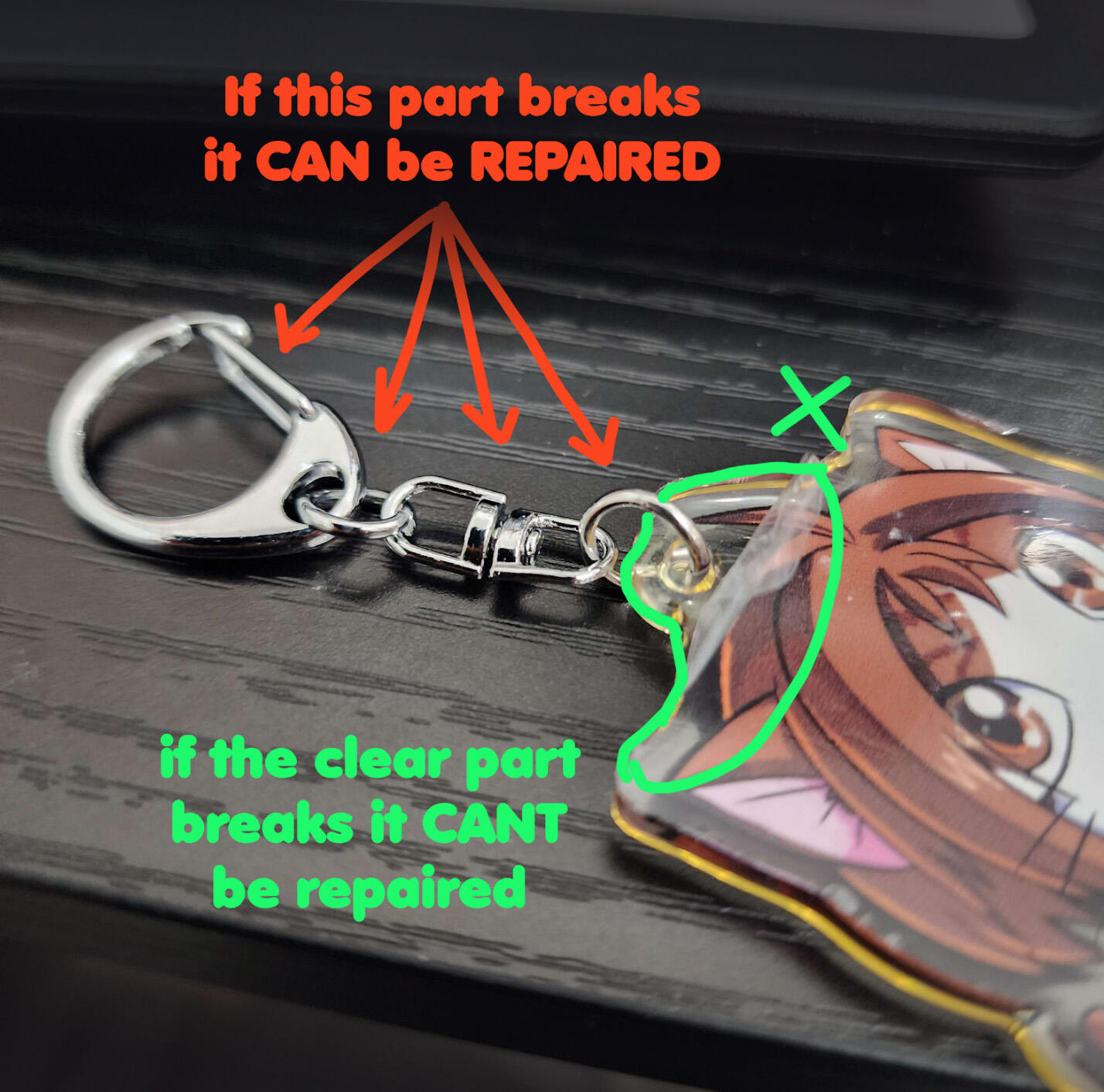 Some Keychains I have are also epoxy sealed for a pretty “dome” looking effect. You will notice the curvature on the surface of the keychain. If the keychain is glittery, it 100% has Epoxy. Over time the epoxy may yellow over time (Average 3 years). Limited exposure to UV rays will slow down the yellowing.After hosting a poll on my twitter, the winner was to stop using epoxy, so we will slowly be phasing it out!If a keychain itself breaks in the metal part, try to catch the acrylic part! The silver/metal part of a keychain is REPAIRABLE and replaceable (You can purchase Keychain attachments via Amazon or at any craft store like Michaels) but if the acrylic breaks, then a new one is necessary.